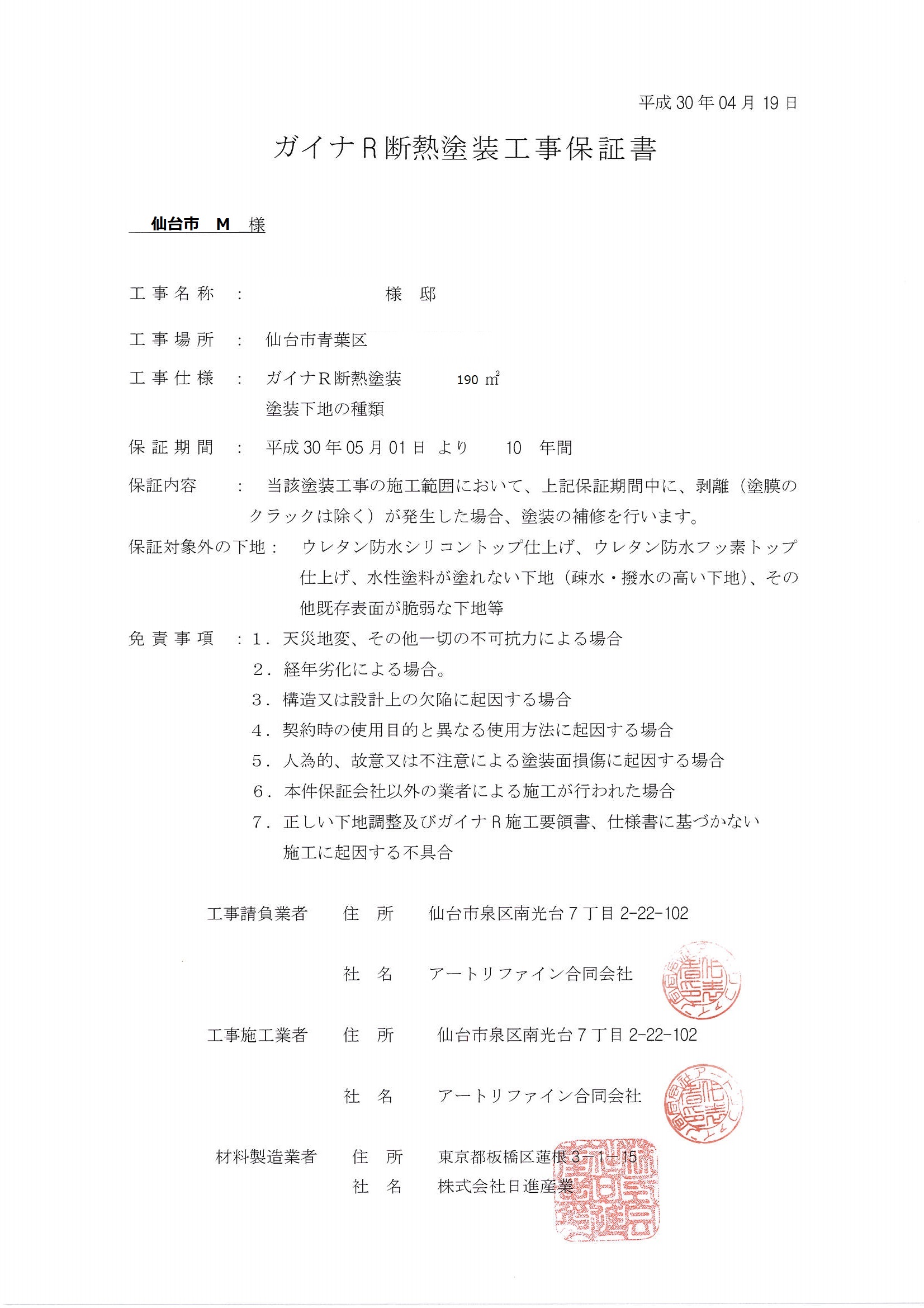 屋根が大きく、リビングが吹き抜けの為、断熱効率が悪く夏がものすごく暑く、冬が寒いとのご相談を受けました。7年ぐらい前よりガイナのことは知っていたそうですが、ハウスメーカーに聞いても知らず仙台では取り扱い店がないと思っていたそうですが最近インターネットで検索いただき弊社に依頼いただきました!※施工事例の多さと、日新産業の保証書も決め手だったそうです。 ありがとうございました!!