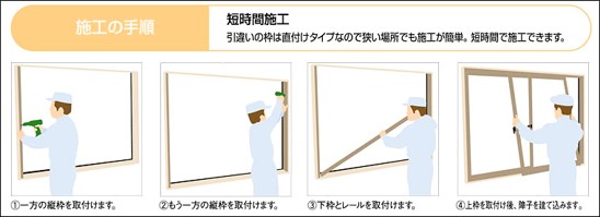 インプラスは、今ある窓の木枠の上下左右にレールをグルッと取付けて、障子をはめ込むだけですので、1ヶ所につき30分以内で工事が完了します。