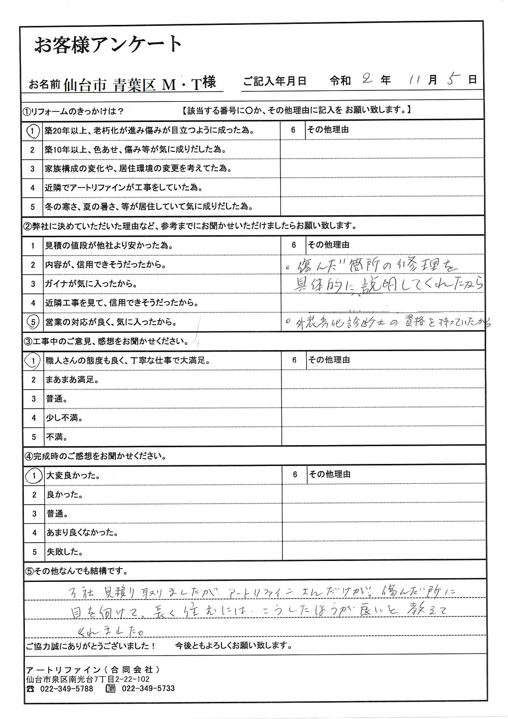 | 説明 | 【お客様談】3社見積もりを取りましたが、アートリファインさんだけが傷んだところに目を向けて 長く住むにはこうしたほうが良いと教えてくれました。 【弊社】アンケートご協力ありがとうございました。今後とも宜しくお願い致します。 |