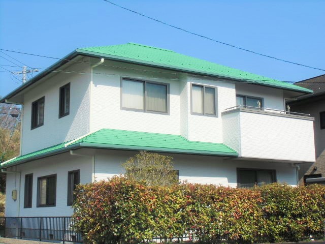 サイディングの外壁塗り替え工事。白い壁と鮮やかなグリーンの屋根へ