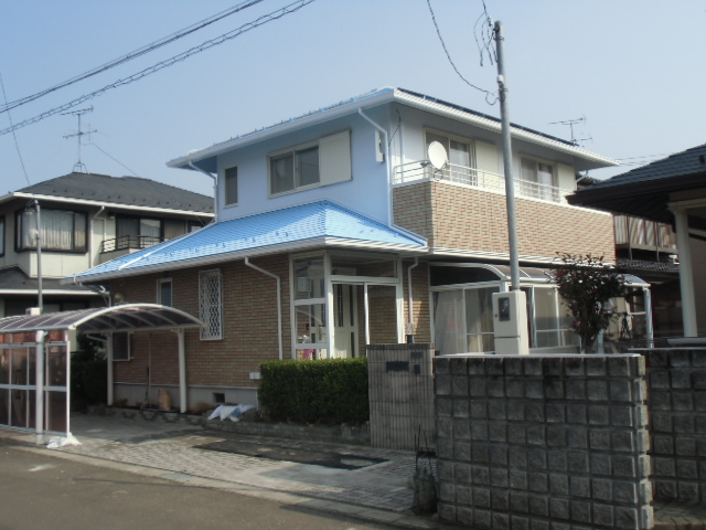 蒸し暑い2階の外壁のみ塗り替え。スカイブルーの鮮やかな屋根に