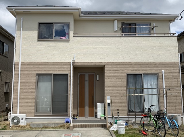 名取市、窯業サイディングの外壁塗装。落ち着いたブラウンへ