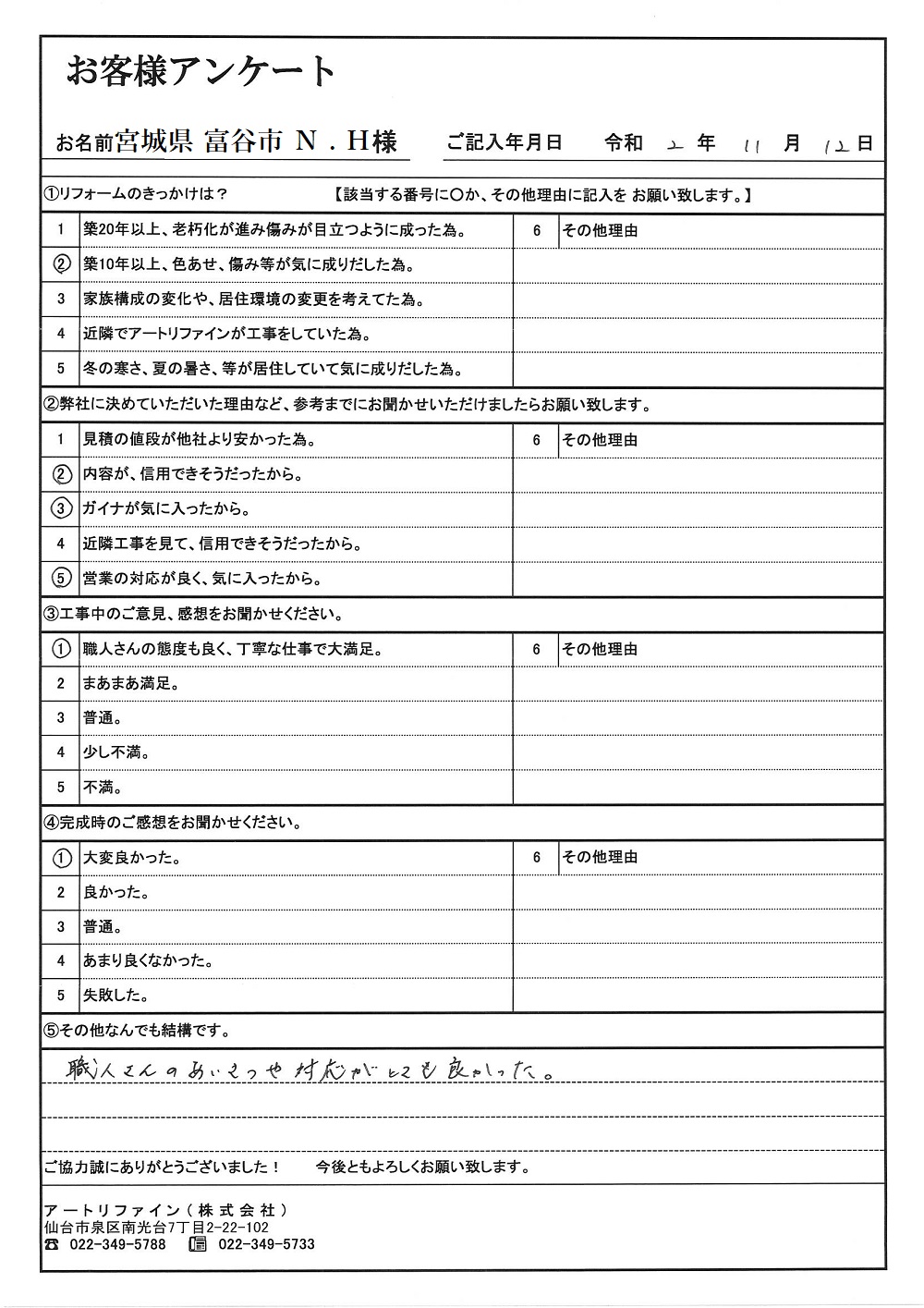 | 説明 | お客様談:職人さんのあいさつや対応がとてもよかった。 弊 社:ご満足いただけましてよかったです、今後とも、宜しくお願い致します。 |