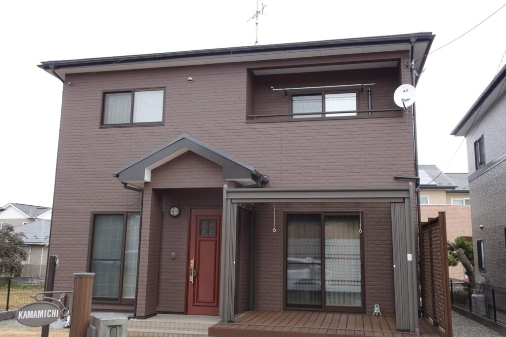 名取市、窯業サイディングの外壁塗装。落ち着いたブラウンへ
